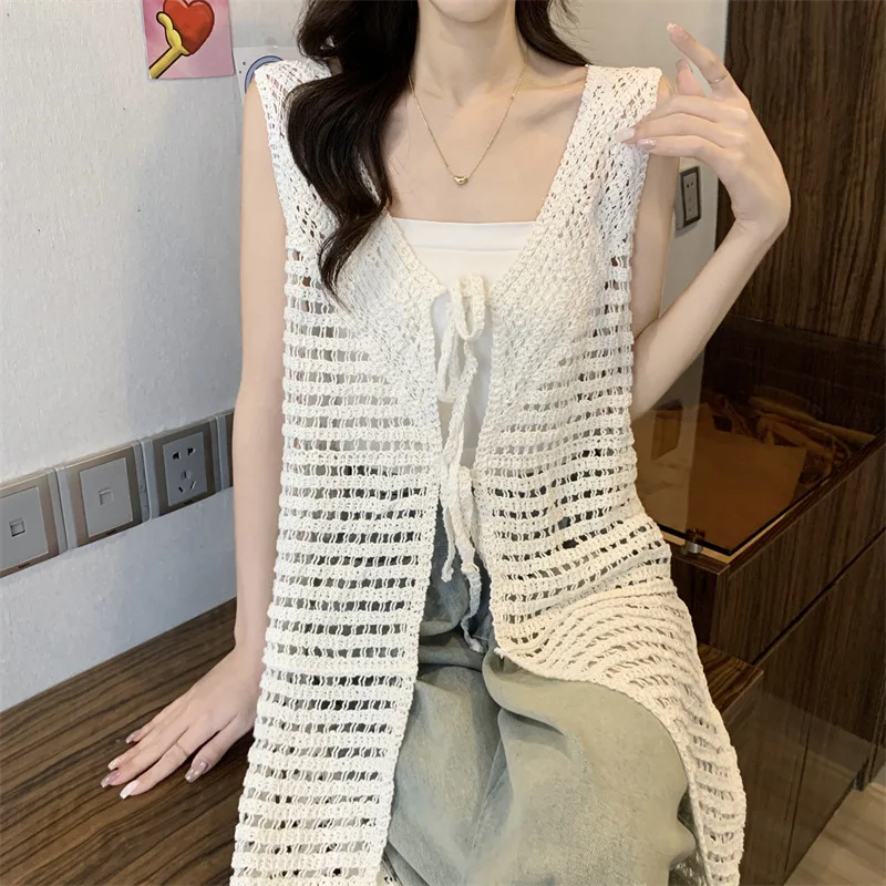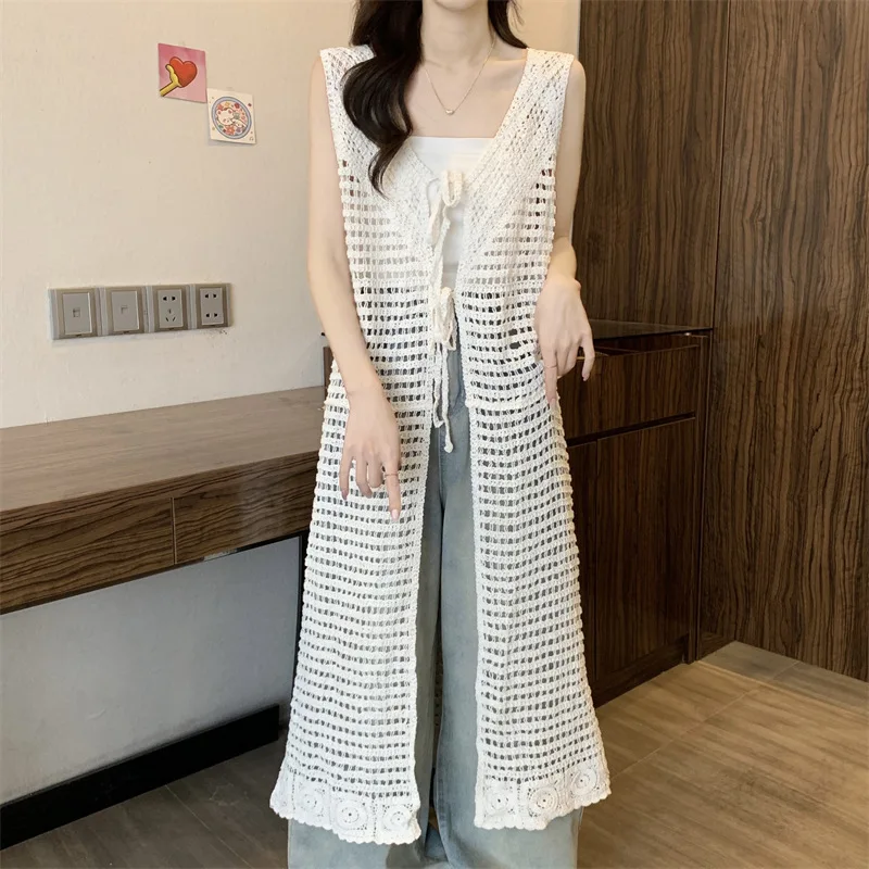 Boring Honey Women Tops Retro Openwork Sleeveless Cardigan Draped Over Loose High-End Long Sunscreen Blouse Fashion Vest Dress